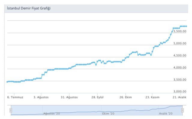 Grafikten de görüleceği üzere fiyatlar hiç aşağı yönlü dönmemiş ve sürekli dik bir çıkış sergilemiştir. Bu da COVID-19 pandemisi gibi zor bir süreçte inşaat sektörünün çok zor günler yaşamasını tetiklemiştir.