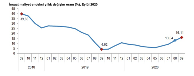 TÜİK’in verilerine göre 2020 yılı Eylül ayında Ağustos 2020’ye göre endeks %2,11 artış gösterdi. Geçen yılın aynı ayı ile kıyaslandığında ise artış tam %16,11 oldu. Malzeme endeksindeki artış bir önceki aya kıyasla %3,48 artış gösterirken geçen yılın aynı ayına göre de %16,90 değerinde bir artış yaşandı. İbrenin süreklü yukarı yönlü olması inşaat sektöründeki paydaşları zorlarken satışların ne yönde değişeceği endişelerini de beraberinde getiriyor.